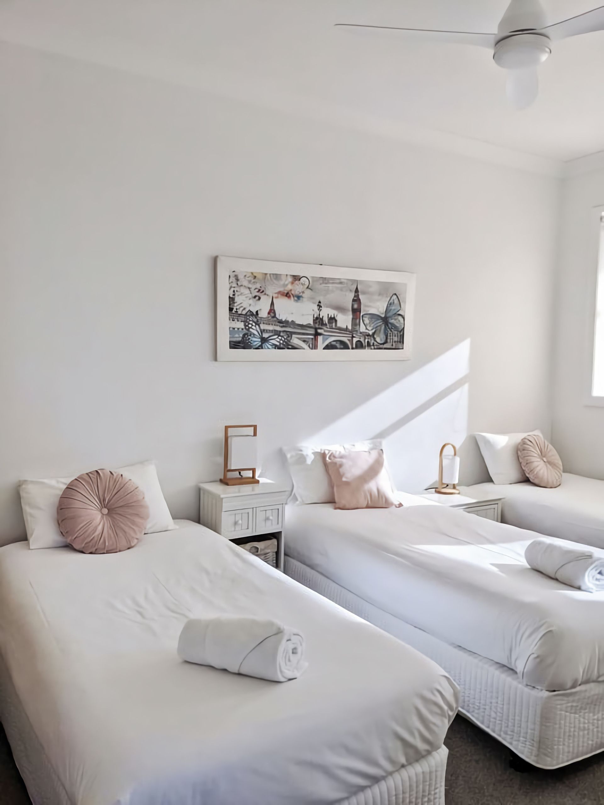 Bedding Configuration Main Bedroom: Queen Bed x 1 Bedroom 2: Queen Bed x 1 Bedroom 3: Single Bed x 3 Living Room: Cushions can be moved off lounge to create additional sleeping.
