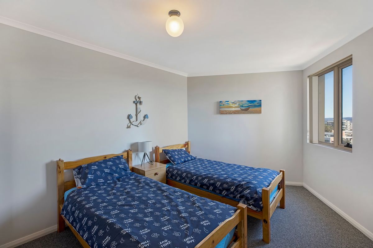 The main bedroom has a queen size bed and the 2nd bedroom has 2 single beds.