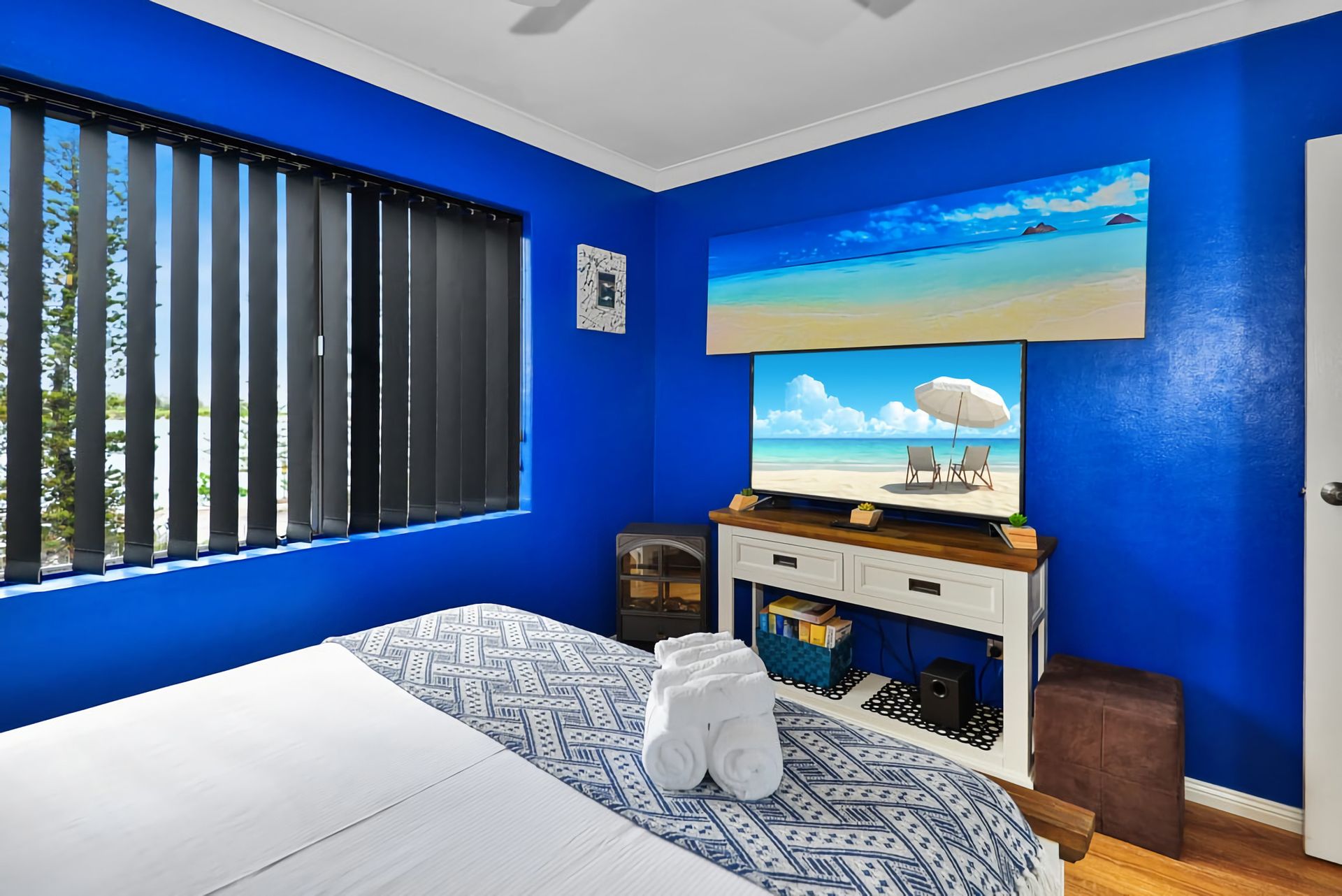 The main bedroom has a Queen bed, ceiling fan, built in wardrobe, 55inch flat screen TV and ocean views.
