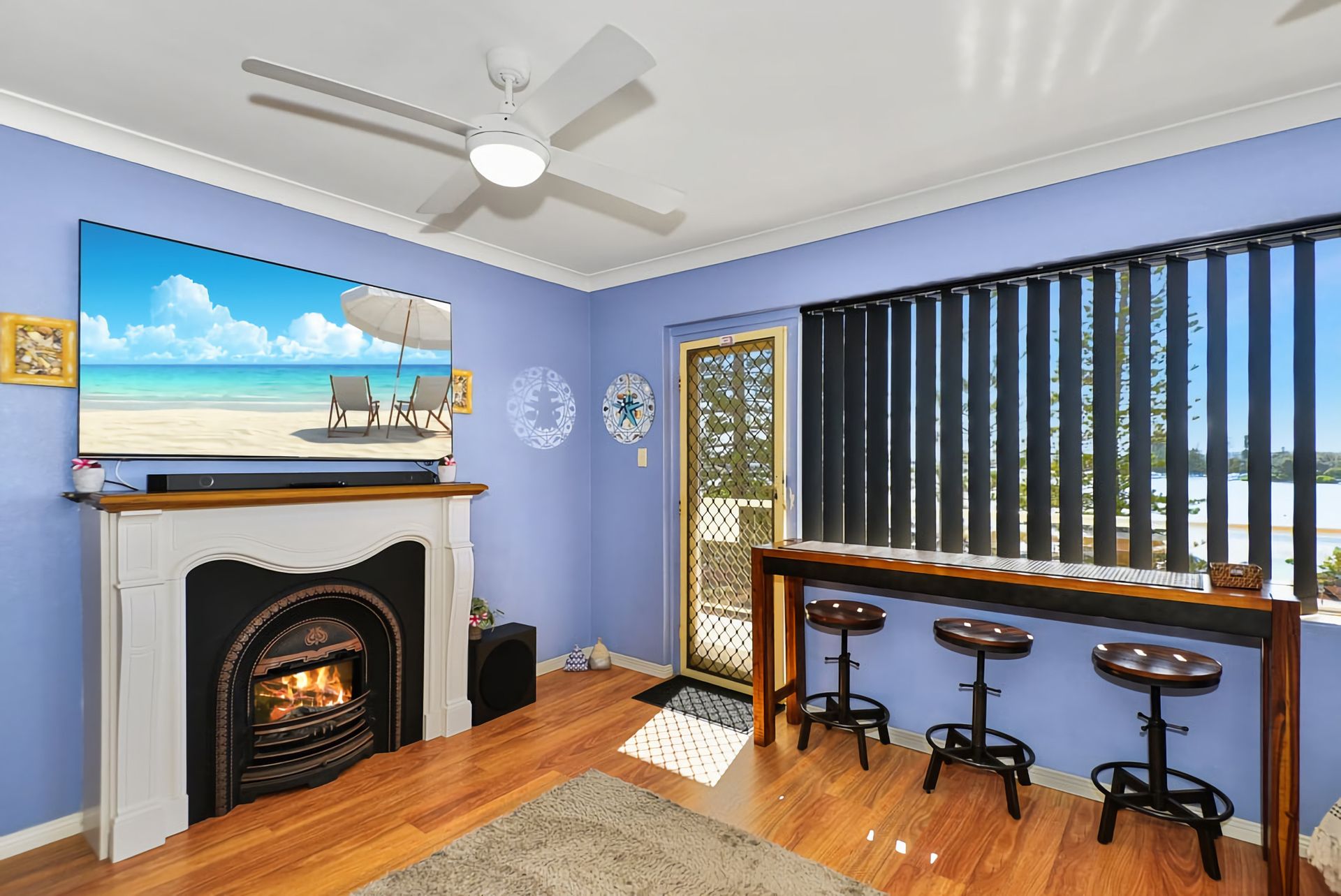 The living room has a large comfortable lounge, ocean and lake views, electric fireplace, 65-inch flat screen TV with surround sound.