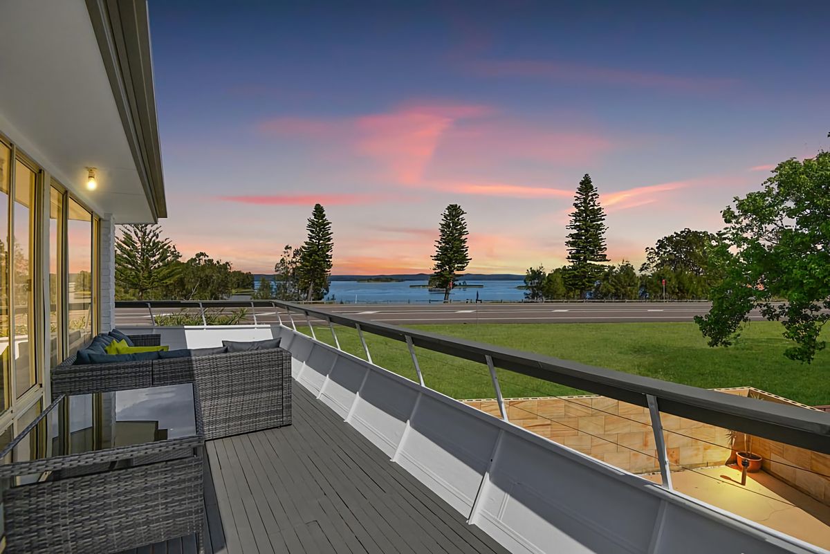 This exquisite property features an open plan living, dining, and kitchen area that seamlessly flows onto a wrap-around balcony, offering breathtaking views of the shimmering Tuggerah Lakes.