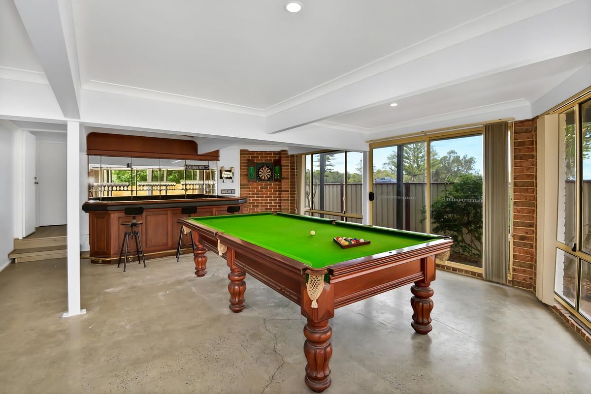 The lower level features the fourth bedroom with two king single beds, as well as a spacious rumpus area equipped with a pool table and television—perfect for family gatherings and entertainment.