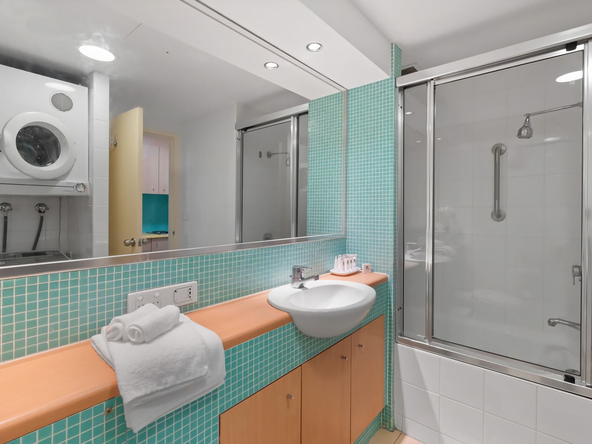 The apartment boasts a modern kitchenette and convenient laundry facilities complete with a washer and dryer. This spacious studio features a queen-size bed, while the lounge offers a comfortable sofa bed, perfect for accommodating little ones.
