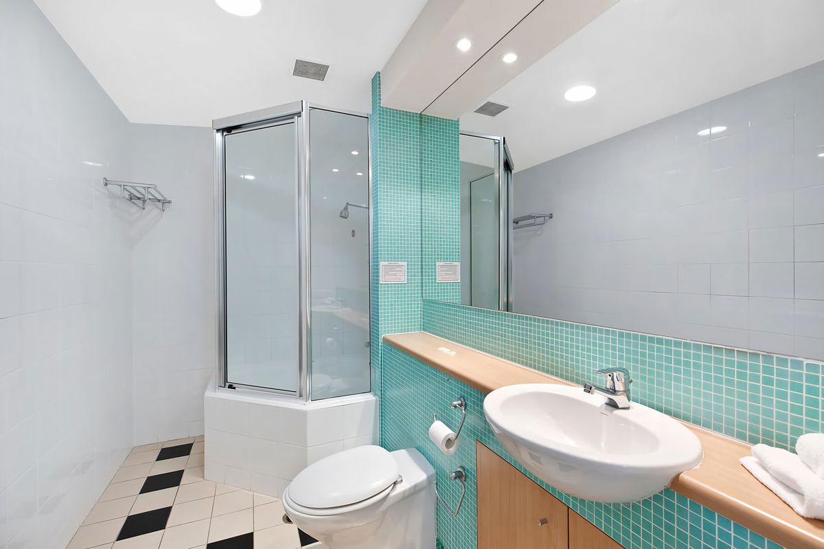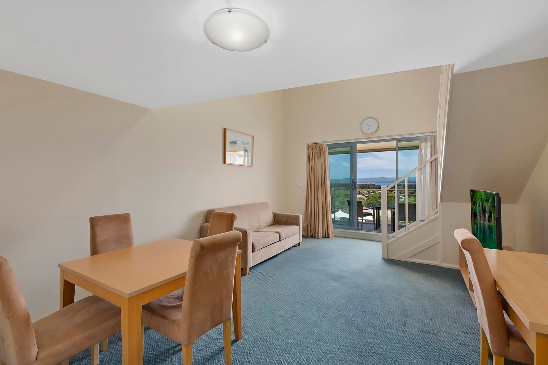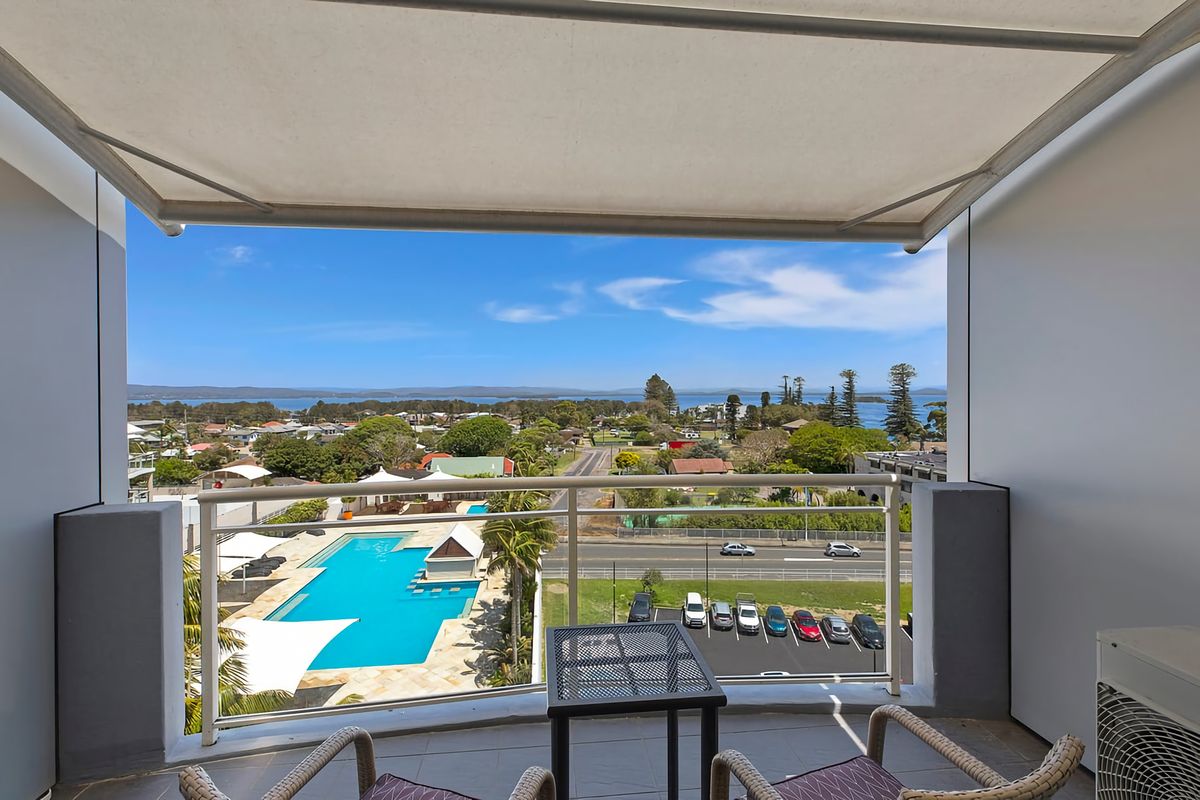 The private balcony offers views of the large onsite swimming pool and panoramic views of Tuggerah lakes from the sixth floor.