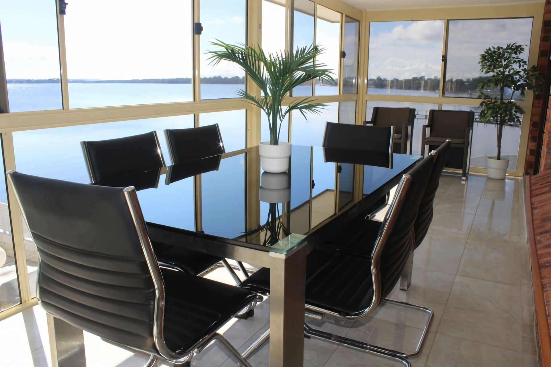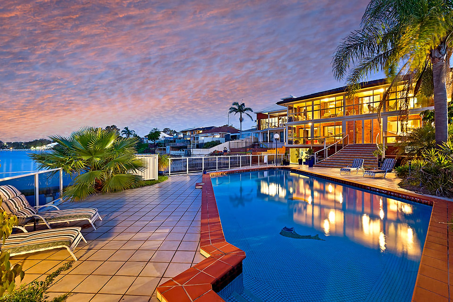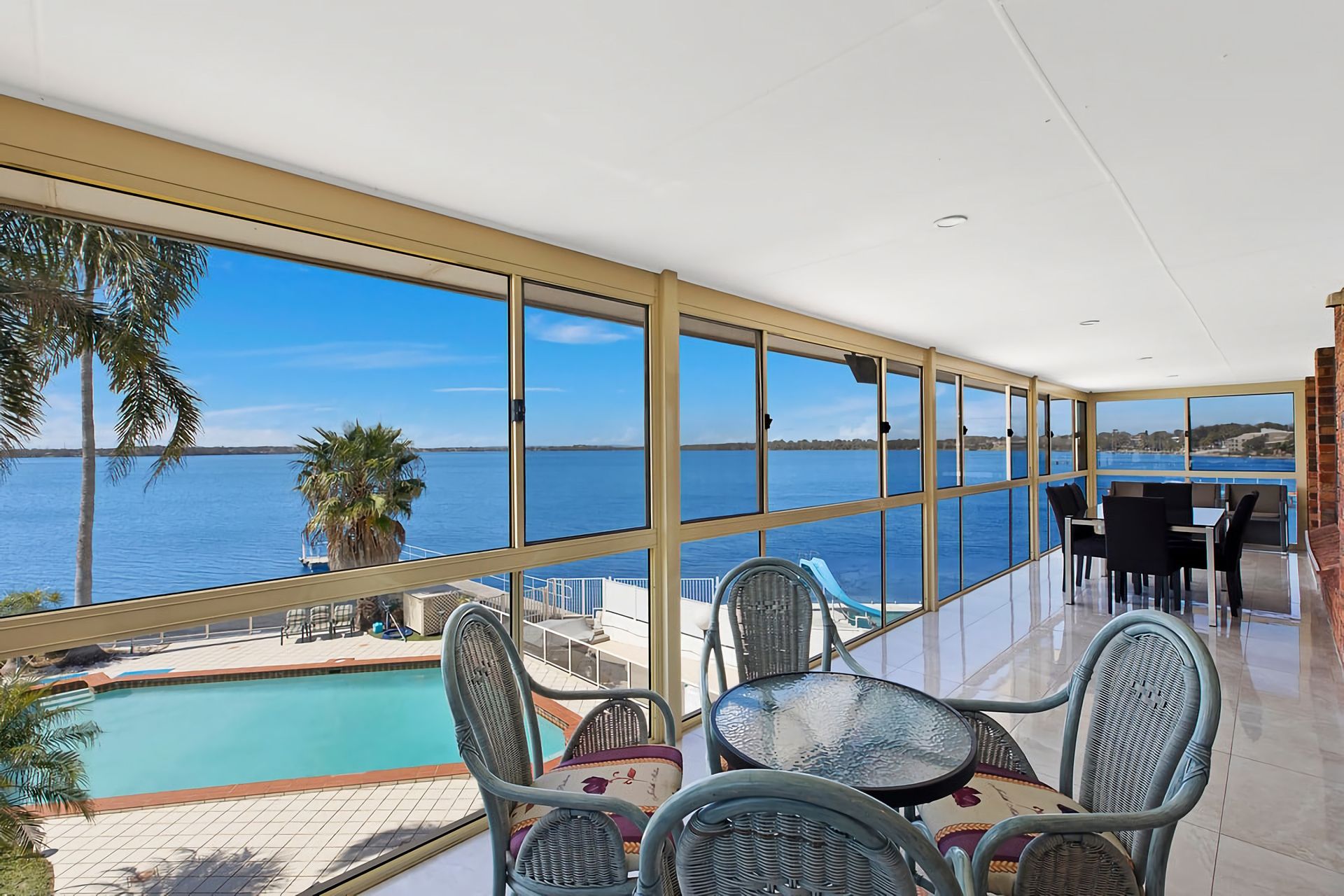 The private waterfront setting is complemented by an in-ground concrete pool surrounded by a glass balustrade to ensure the uninterrupted water view is maintained.
